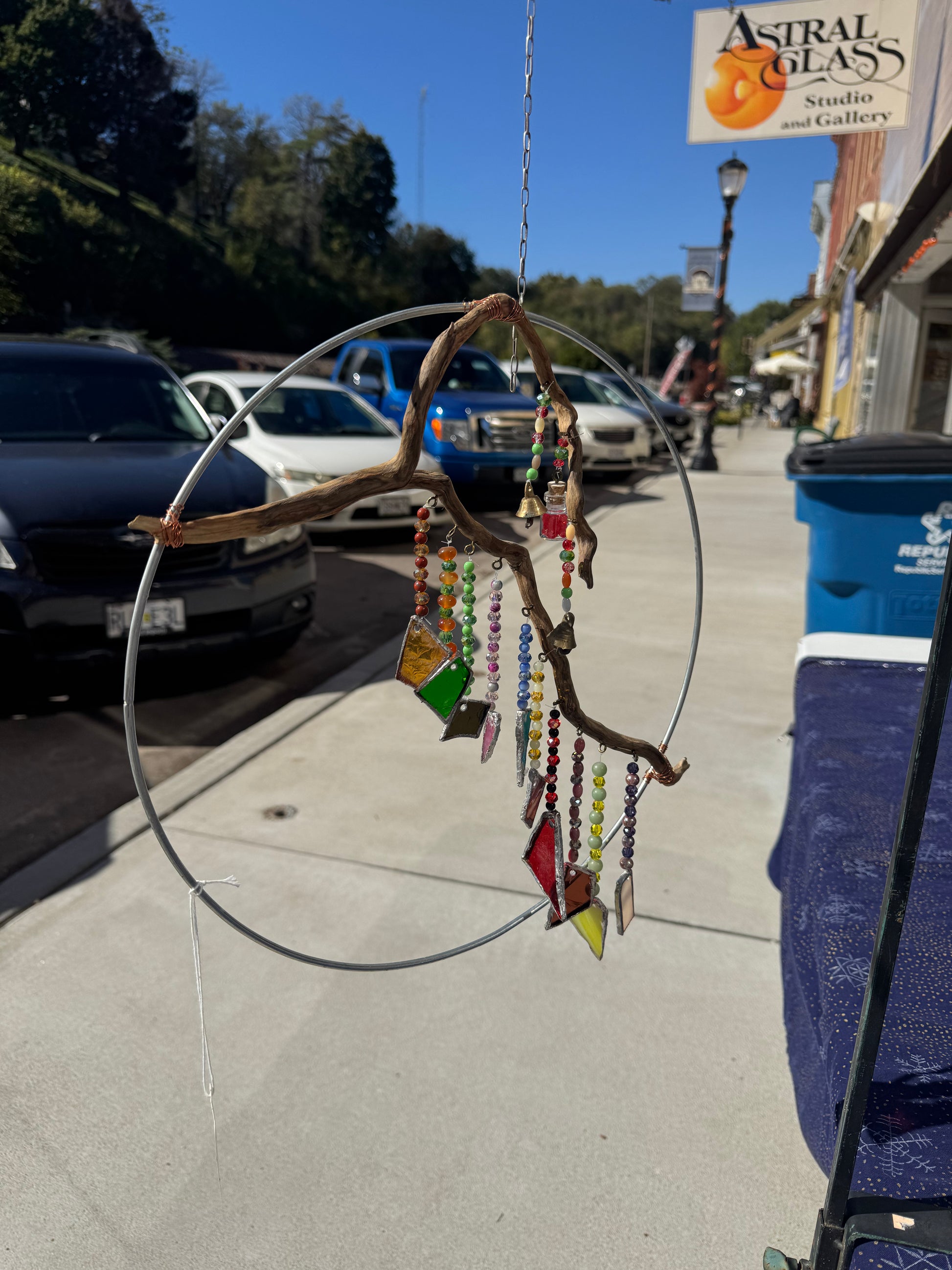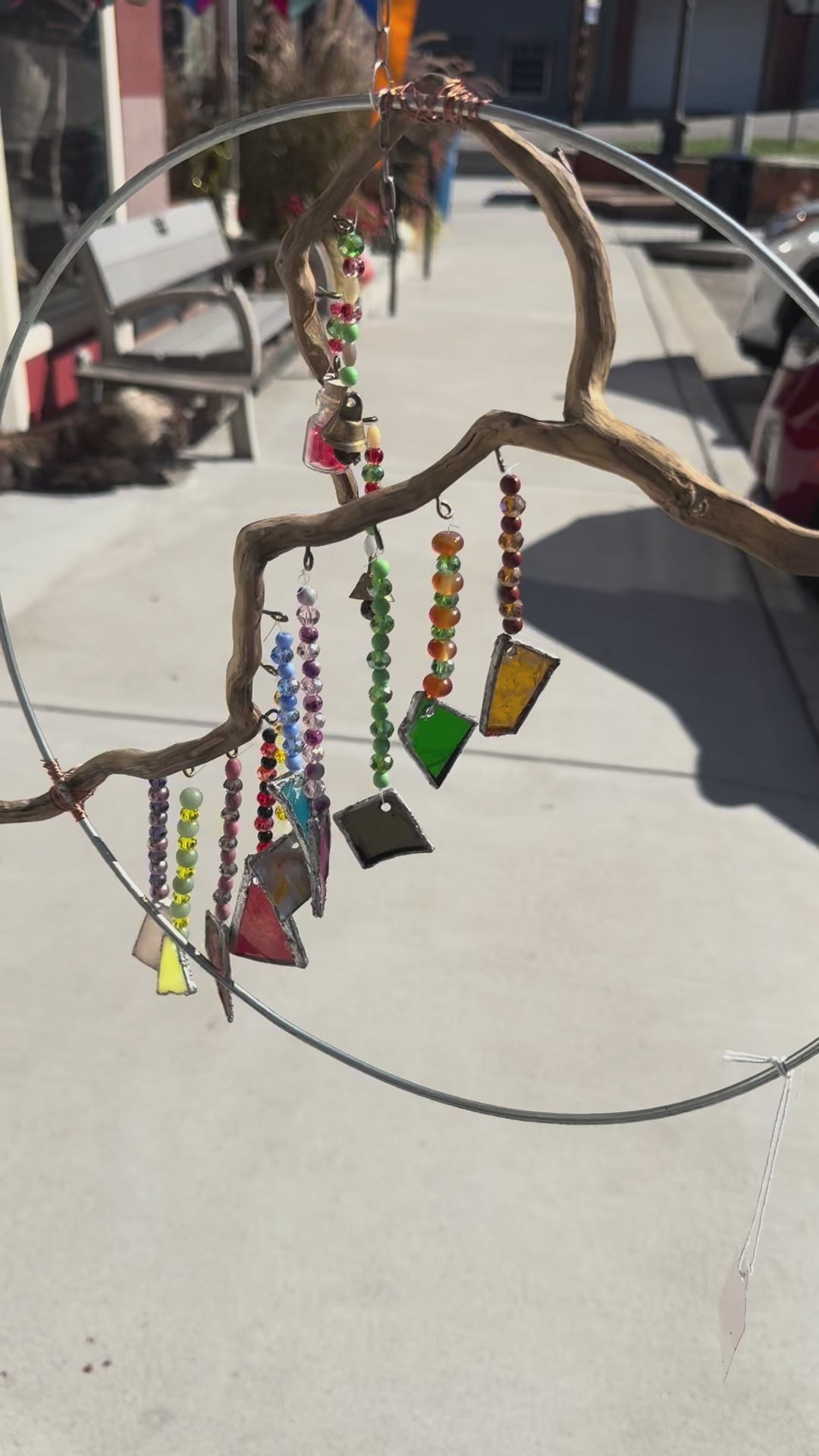 Multicolor handmade suncatcher hung from a driftwood forked branch inside a metal hoop.