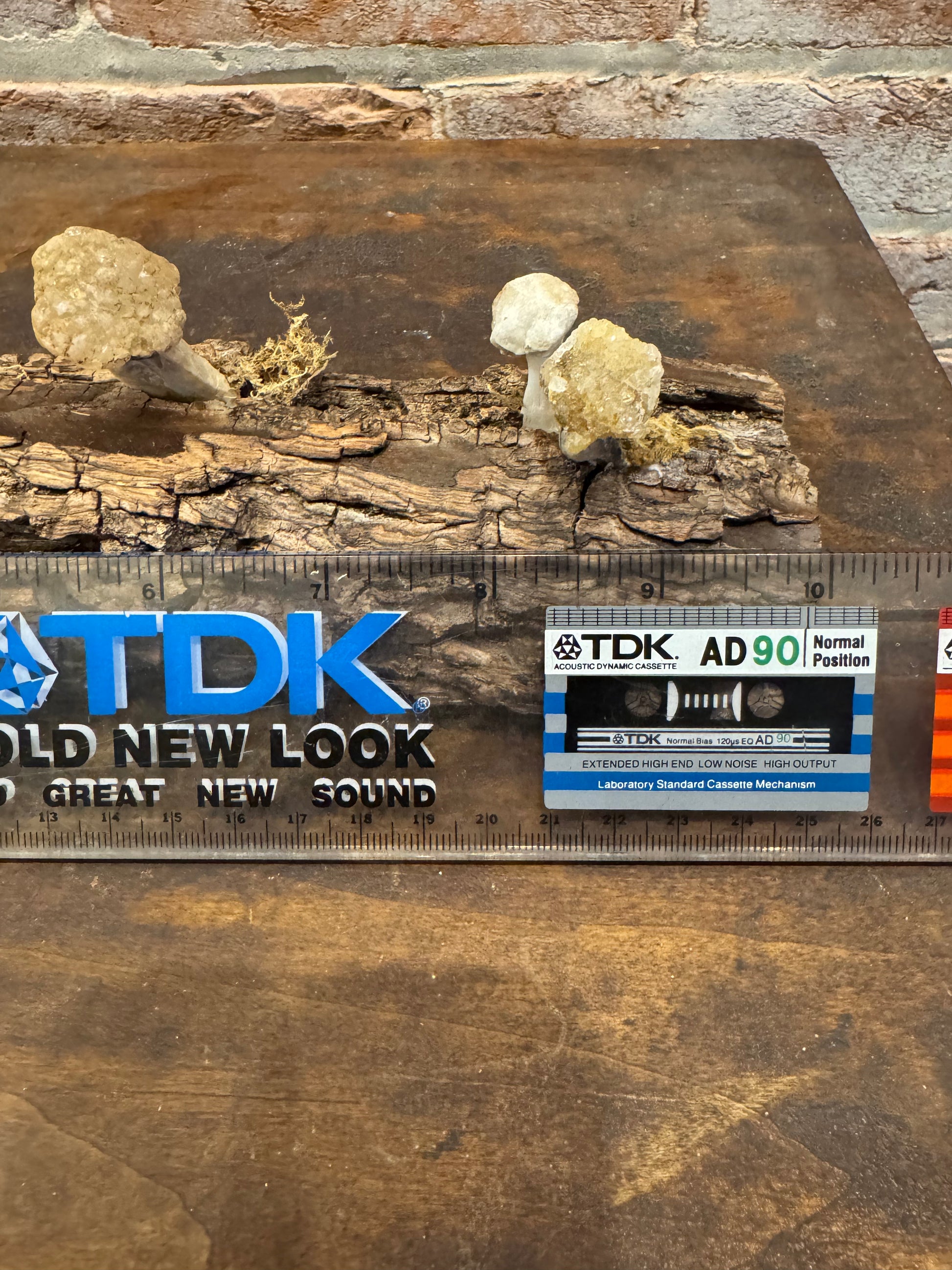 Handcrafted quartz mushrooms on bark art sculpture home decor