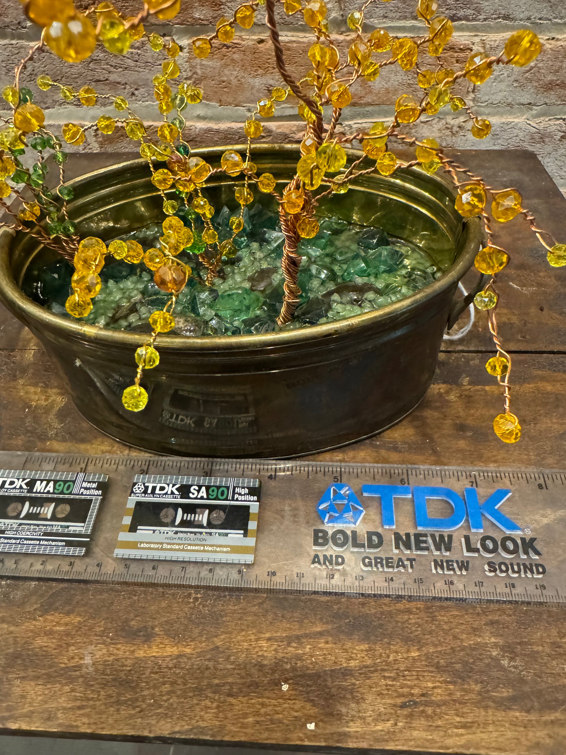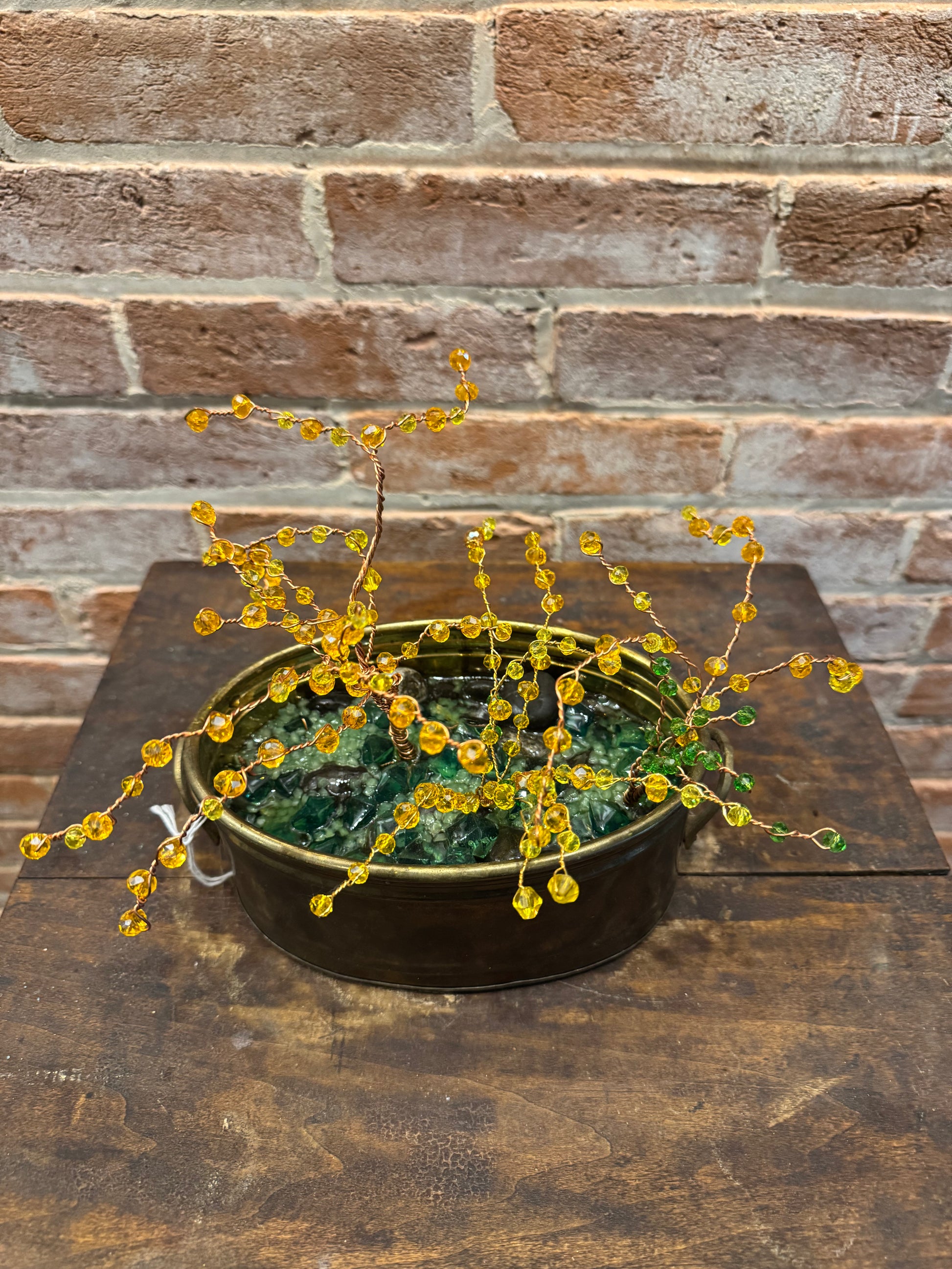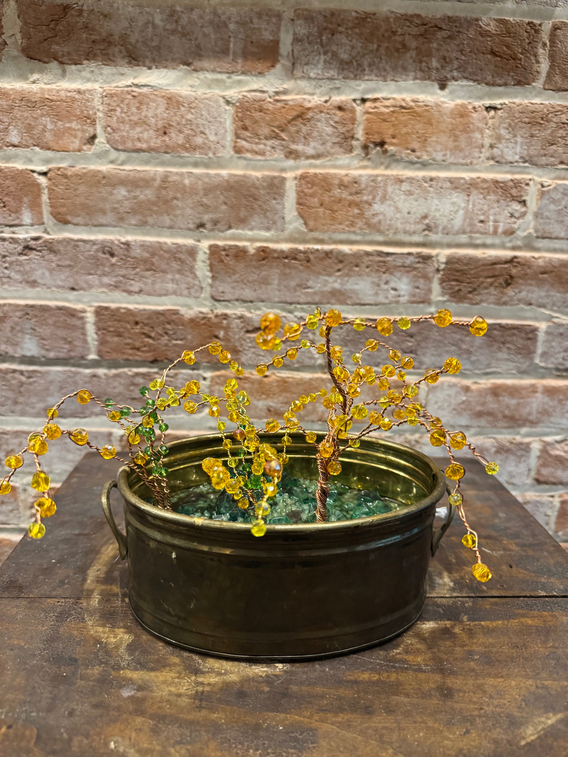 Handcrafted Wire and Bead Forsythia Bush in Small Vtg Brass Planter