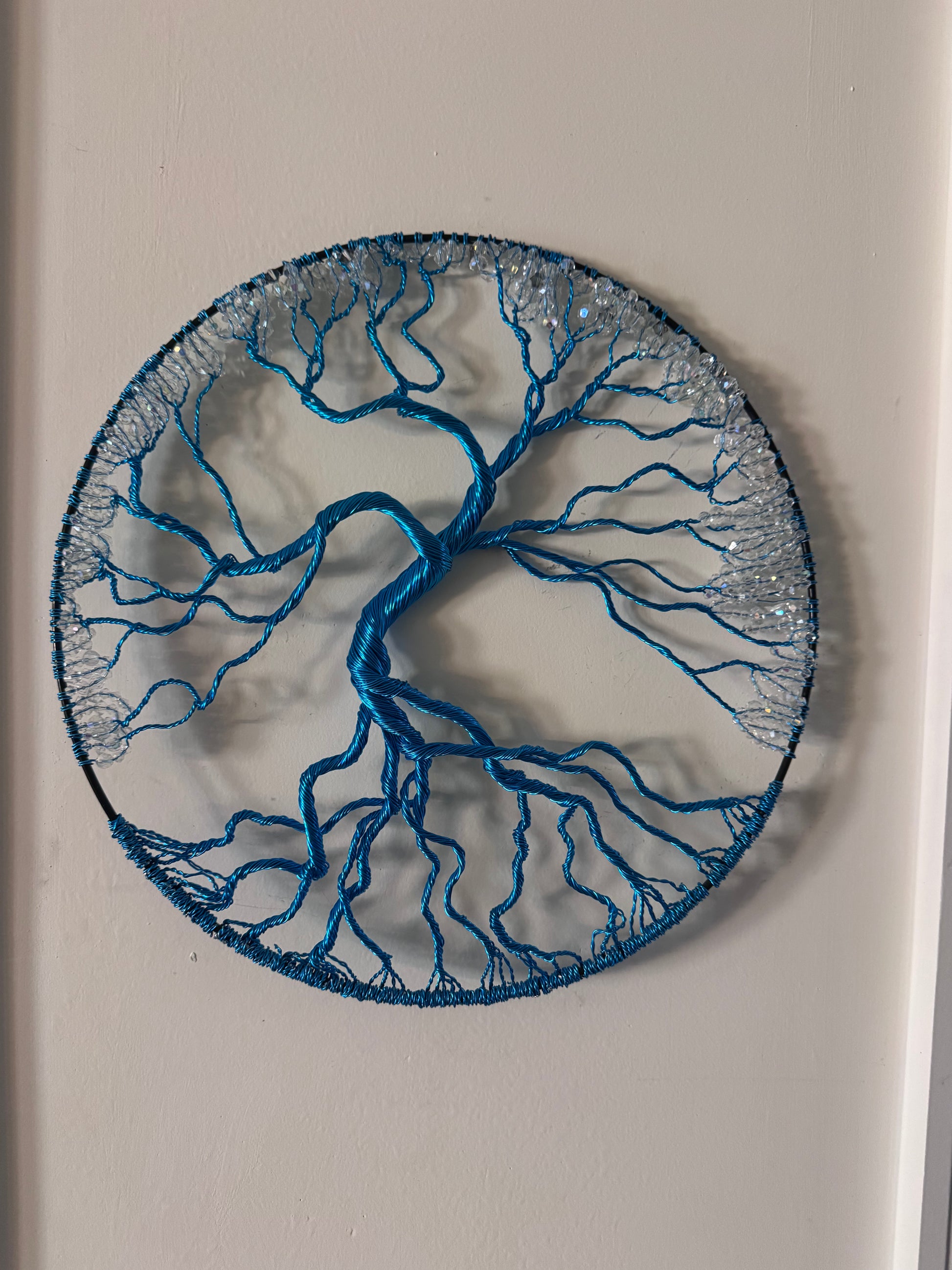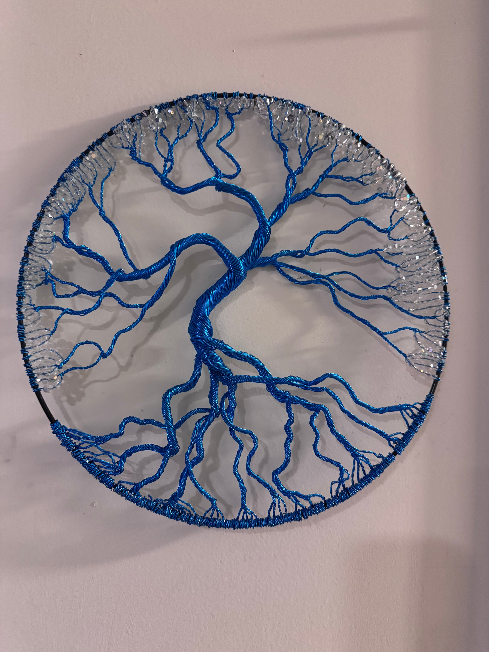 Blue Vibes is a tree of life with clear and crystal glass bead leaves on a 12" hoop.