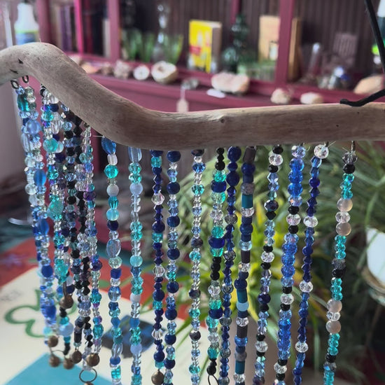This suncatcher features 20 strands of blue, black and clear glass and stone beads accented with tiny brass bells on the end of each string. The beads are hung on a piece of hand-sourced Missouri driftwood.