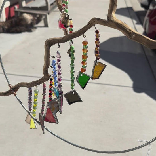 Multicolor handmade suncatcher hung from a driftwood forked branch inside a metal hoop.