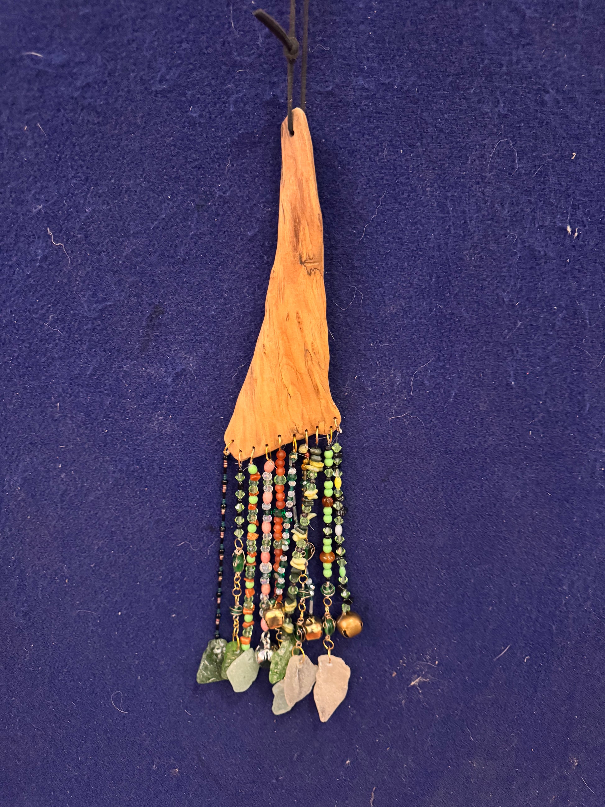 Multicolor shades of green unique suncatcher handmade and hung from California driftwood. The piece is accented with sea glass ends that make gentle sounds in the wind.